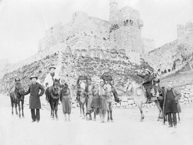 L’abbé Alphonse Têtu et d’autres prêtres devant la tour de David à Jérusalem