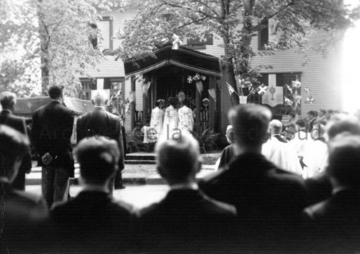 Prêtres devant un reposoir lors d’une procession de la Fête-Dieu